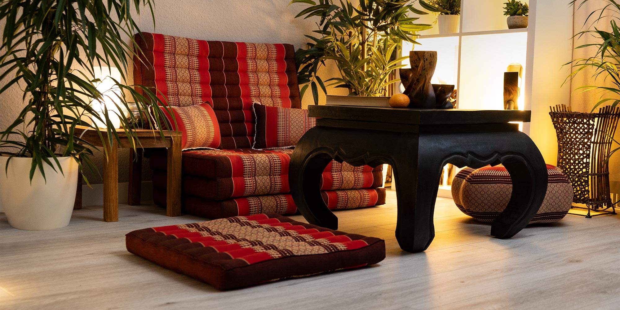 Ils existent en une, deux ou trois éditions. En version XXL, les coussins thaï conviennent aussi parfaitement à différents types de public. Les coussins thaï, les matelas pliables et les nattes d’Extrême-Orient sont parfaits pour se détendre : installez-vous confortablement et laissez vos pensées circuler et faire place au bien-être. Nos coussins de sol, nattes et matelas pliables rembourrés en kapok sont également fort populaires comme supports de yoga et méditation. Ils sont parfaitement adaptés aux exercices spirituels et permettent une harmonise idéale entre le corps et l’esprit.
